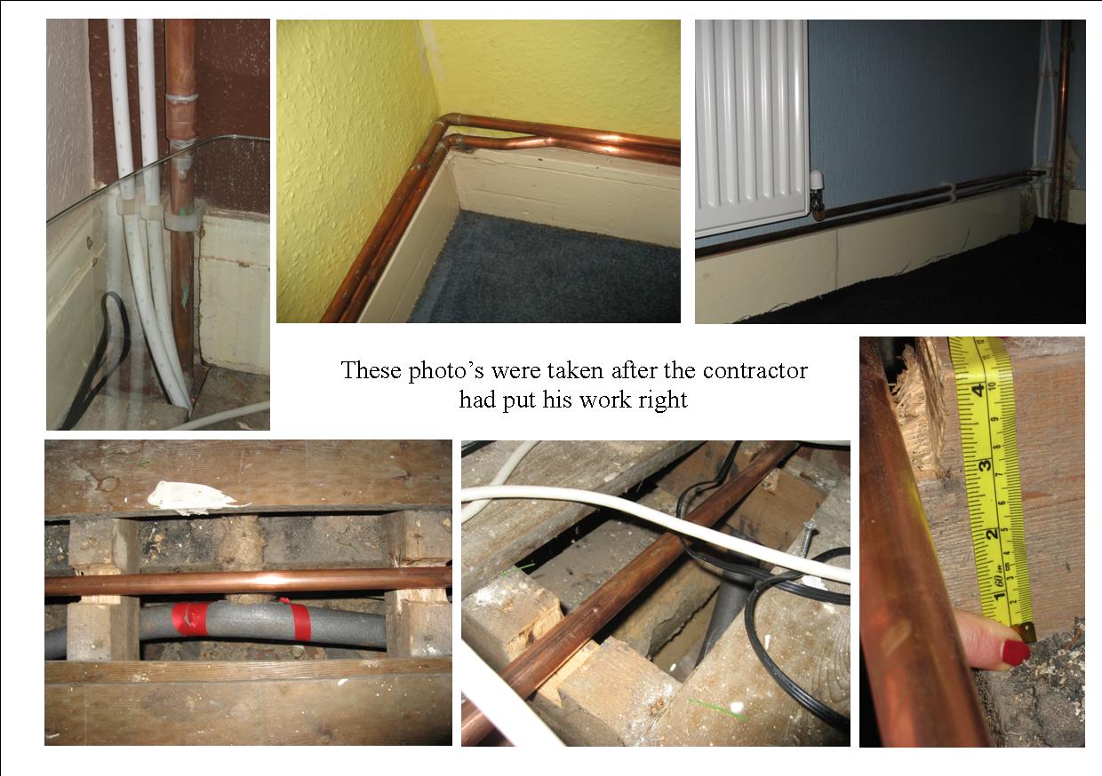 The end result is the lady still has the notches in the floor joists, still has varying diameter gas pipes with an end pressure on the very minimum feed for the gas boiler. The pipe work still runs up the walls and over the floors.