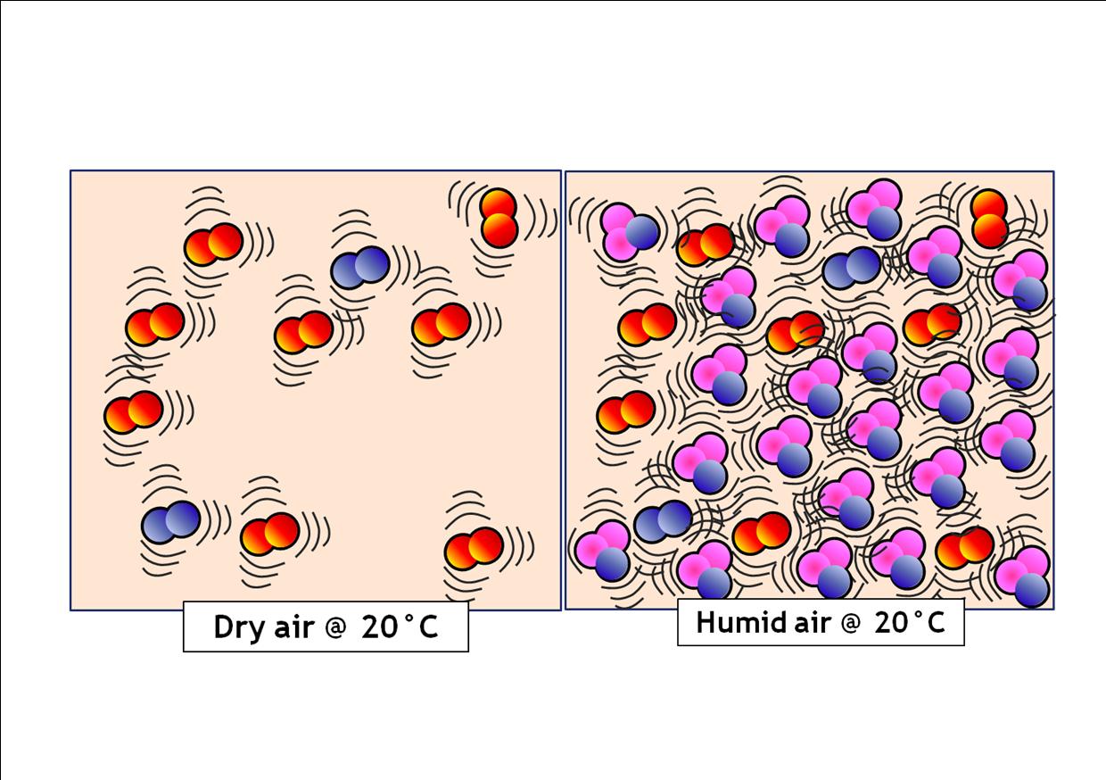 So dry air is less dense than humid air at the same temperature. The warmer the air the fewer number of molecules therefore they get pushed upwards (rise).