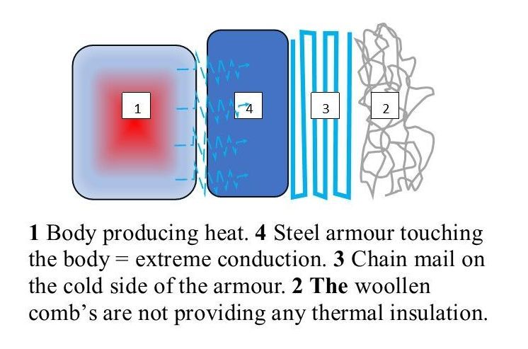 Chain mail, although metal is dense and readily conducts thermal energy, the wire diameter is relatively small with air spaces between each wire. The woollen comb's prevent any conduction from the body, creating a thermal barrier.